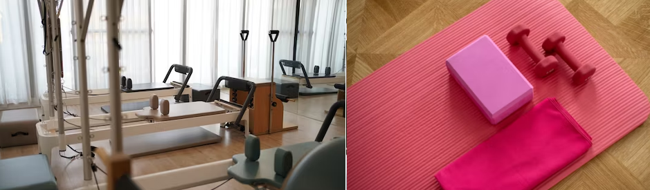 - 요가: 기본적으로는 매트를 사용하지만, 필라테스처럼 특별한 운동 도구를 사용하는 것은 흔치 않습니다. 동작이 잘 나오지 않거나 가동범위의 제한이 있는 사람들을 위해 소도구를 사용하기도 하며, 수업의 다양성을 위해 여러 Prop들을 사용하기도 합니다.